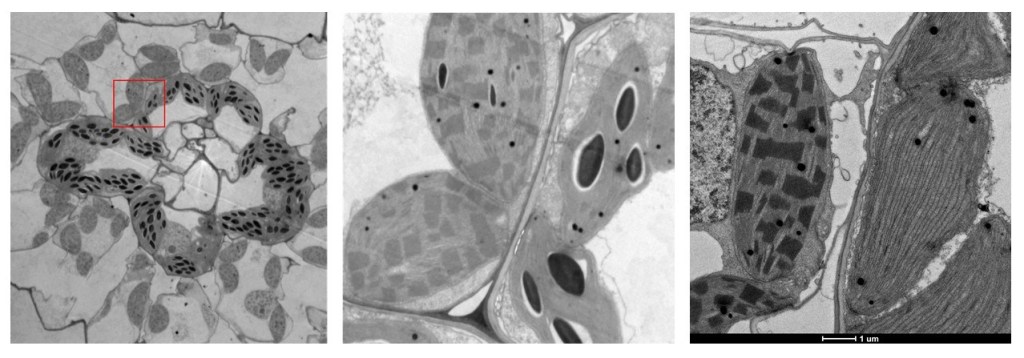 In maize leaves, closely spaced veins are encircled by concentric layers of photosynthetic bundle sheath and mesophyll cells, the anatomy named by the German word “Kranz”. There are consistently 2 mesophyll cells between bundle sheath, and dark green chloroplasts are enriched in bundle sheath cells, compared to rice leaves. Also note that non-stacked thylakoid membranes and accumulated starch specifically display in bundle sheath chloroplasts, different from those in mesophyll cells, known as chloroplast dimorphism.