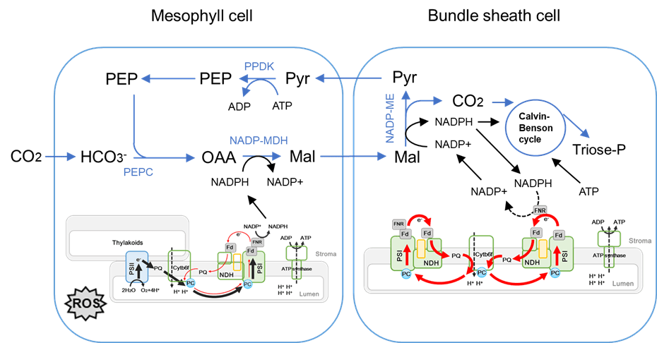 In C3 photosynthesis, everything happens in a single type of mesophyll cell, so that Rubisco has to react with O2, competing with CO2 fixation. Whereas in C4 plants, there are functionally differentiated bundle sheath cells and mesophyll cells surrounding the viens, with cell specific distribution of C4 enzymes, so that CO2 can be enriched through mesophyll cells into bundle sheath cells, where Rubisco is located and can fix CO2 with increased efficiency. The maize C4 pathway involves promoted cyclic electron transport to provide extra ATP, optimize C4 carbon flow and balance cellular redox. Interestingly, cyclic electron transport, together with carboxysome microcompartment, is also important component of the cyanobacteria CO2 concentrating mechanisms.